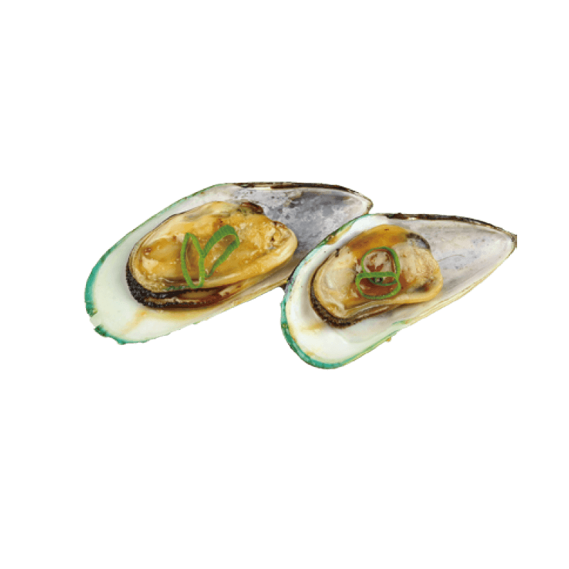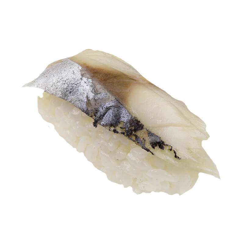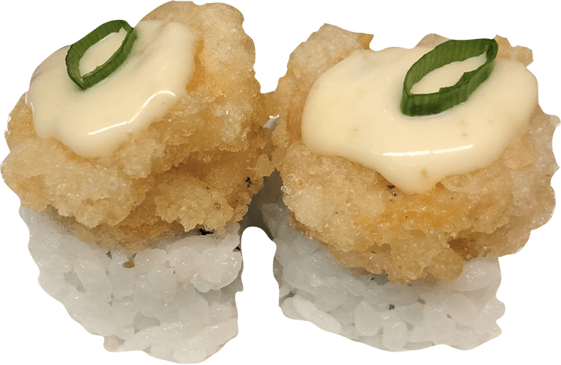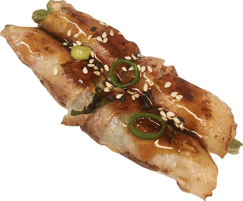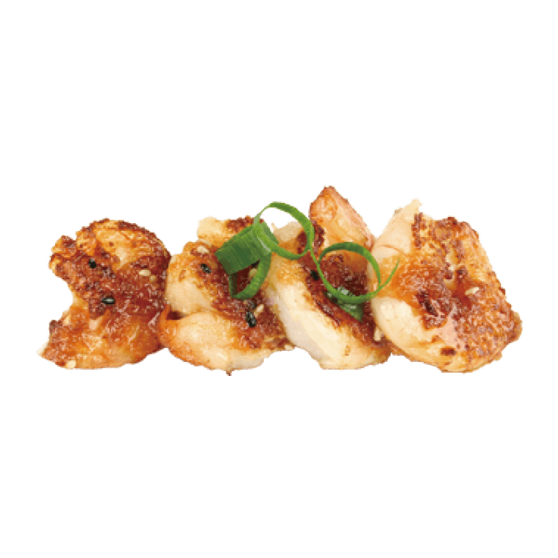 gefrituurde garnaal, komkommer, geflambeerde zalm, bosui