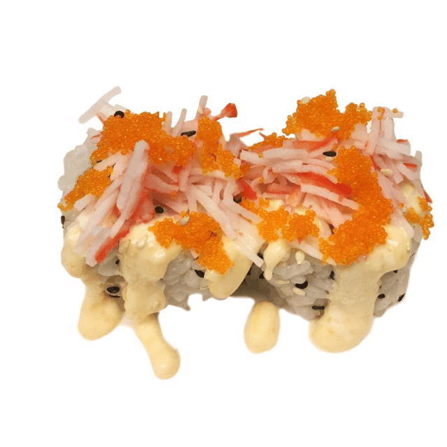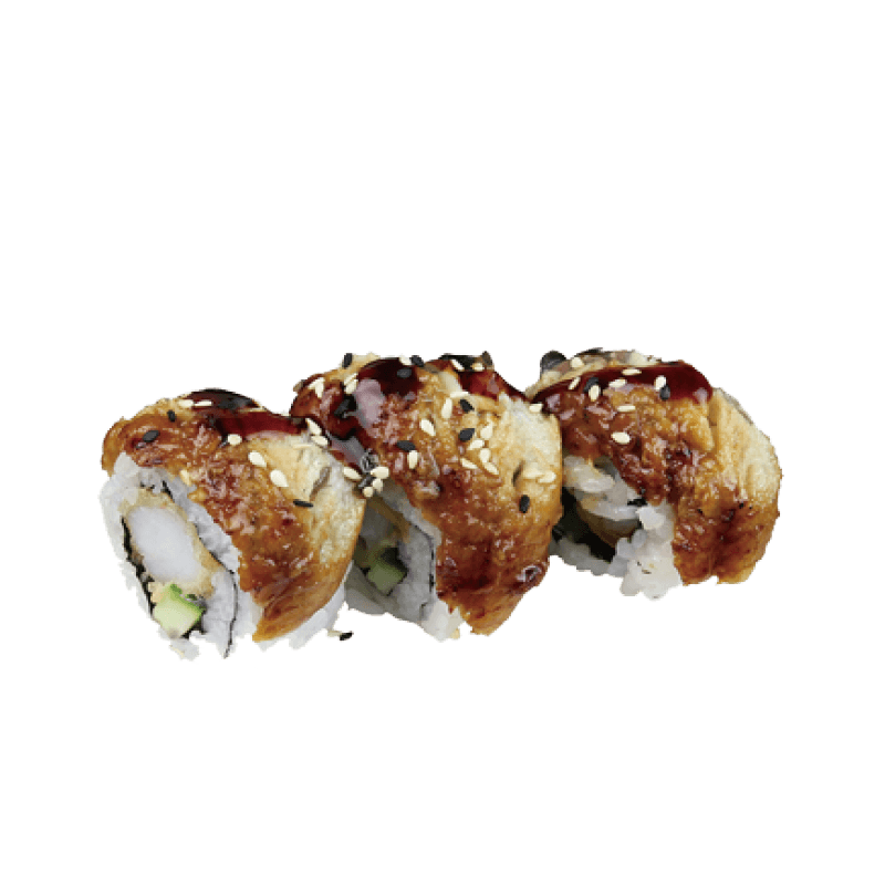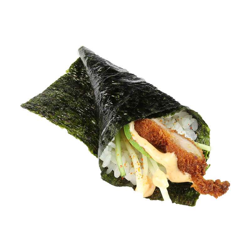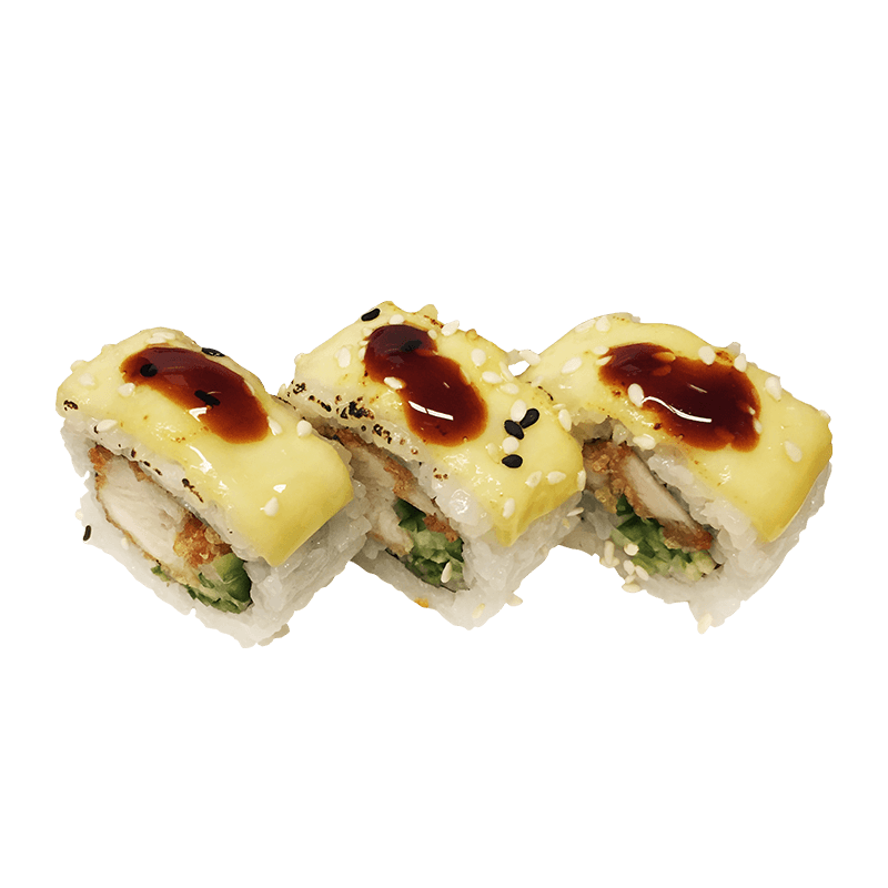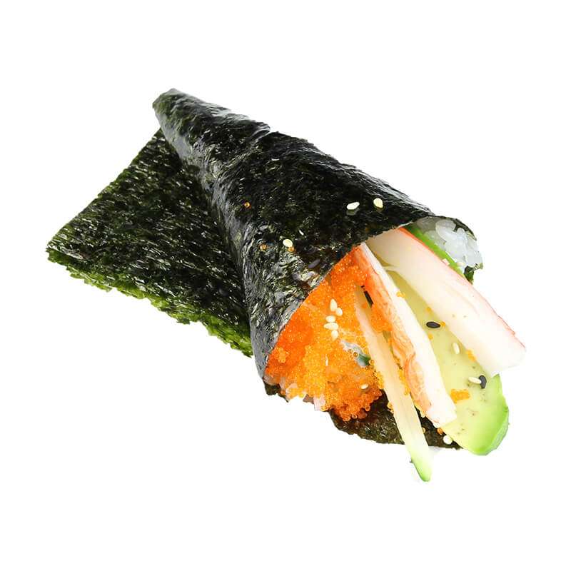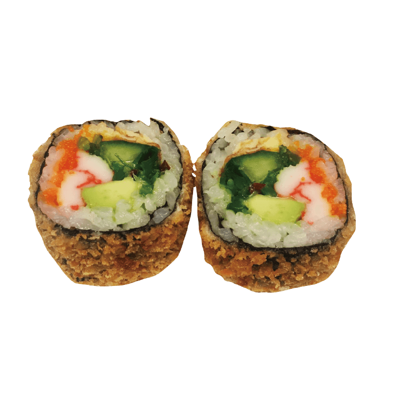 Gefrituurde grote rol met: viskuit, avocado, komkommer, surimi krab, omelet & zeewier