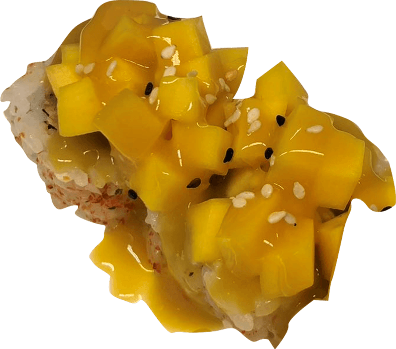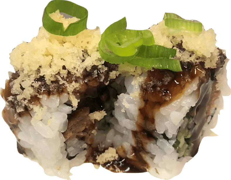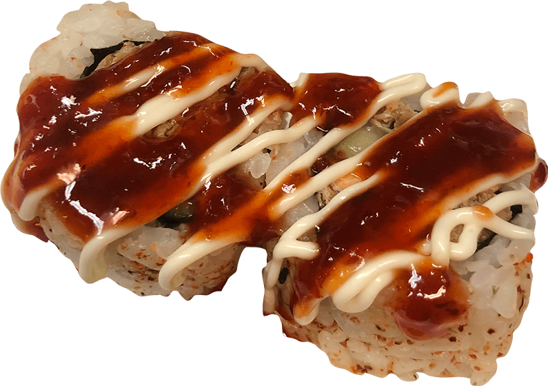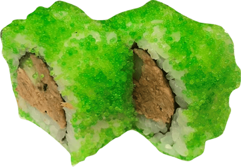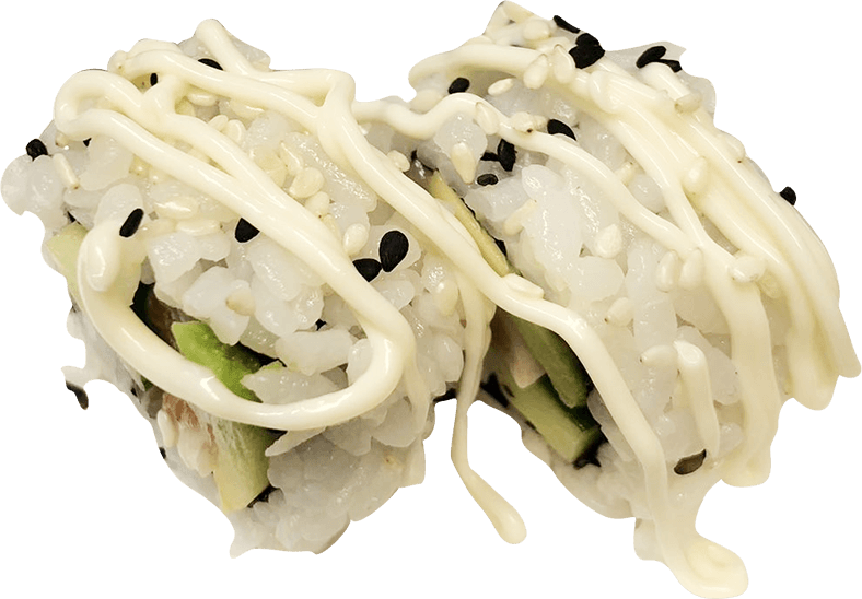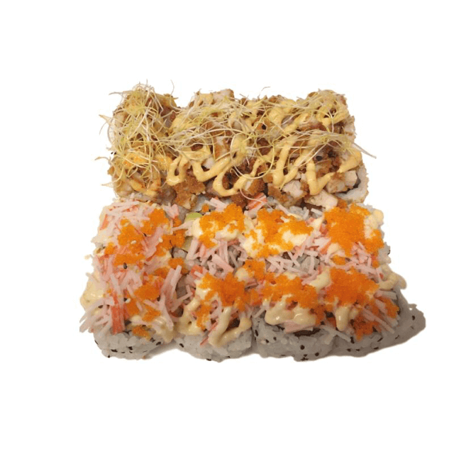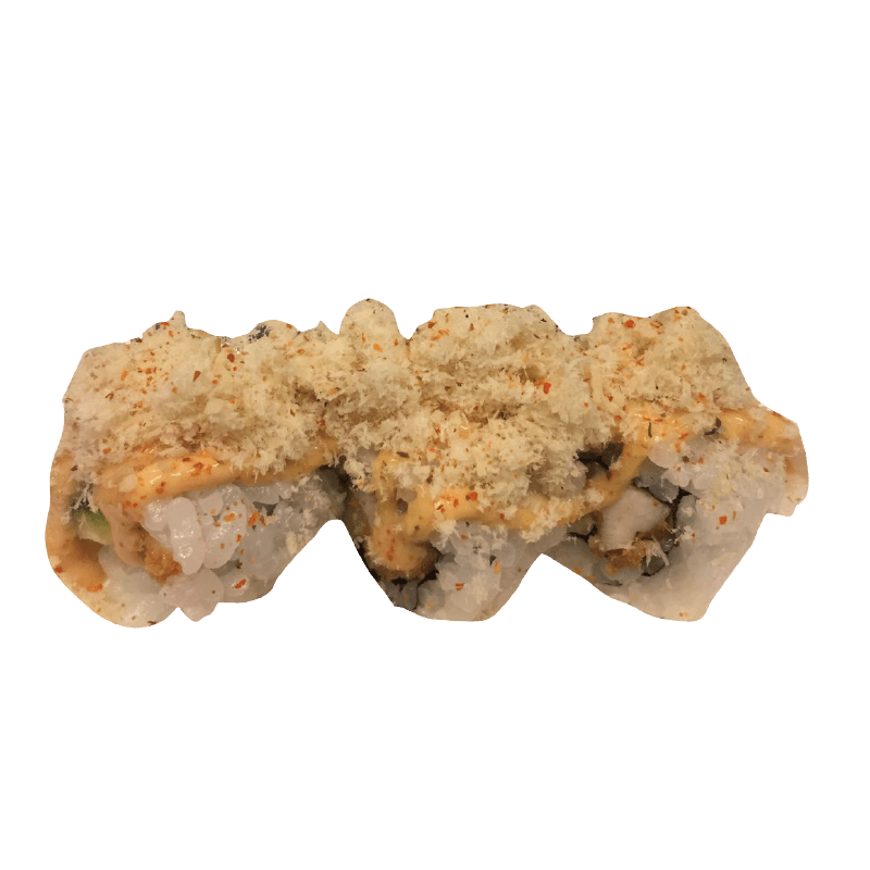 Gefrituurde grote rol met: viskuit, avocado, komkommer, surimi krab, omelet & zeewier