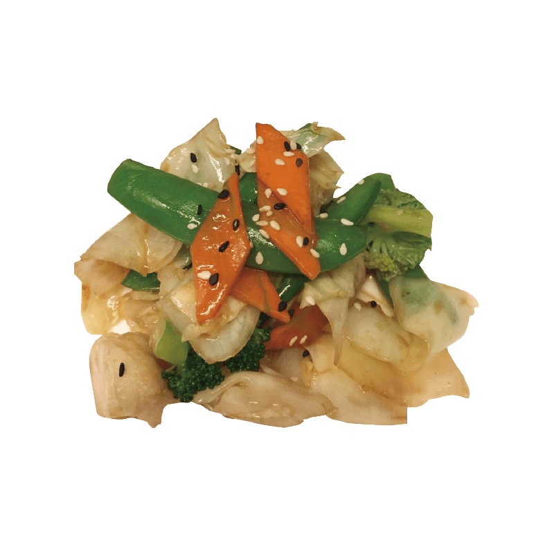Gewokte spitskool, sugarsnaps, wortel & broccoli